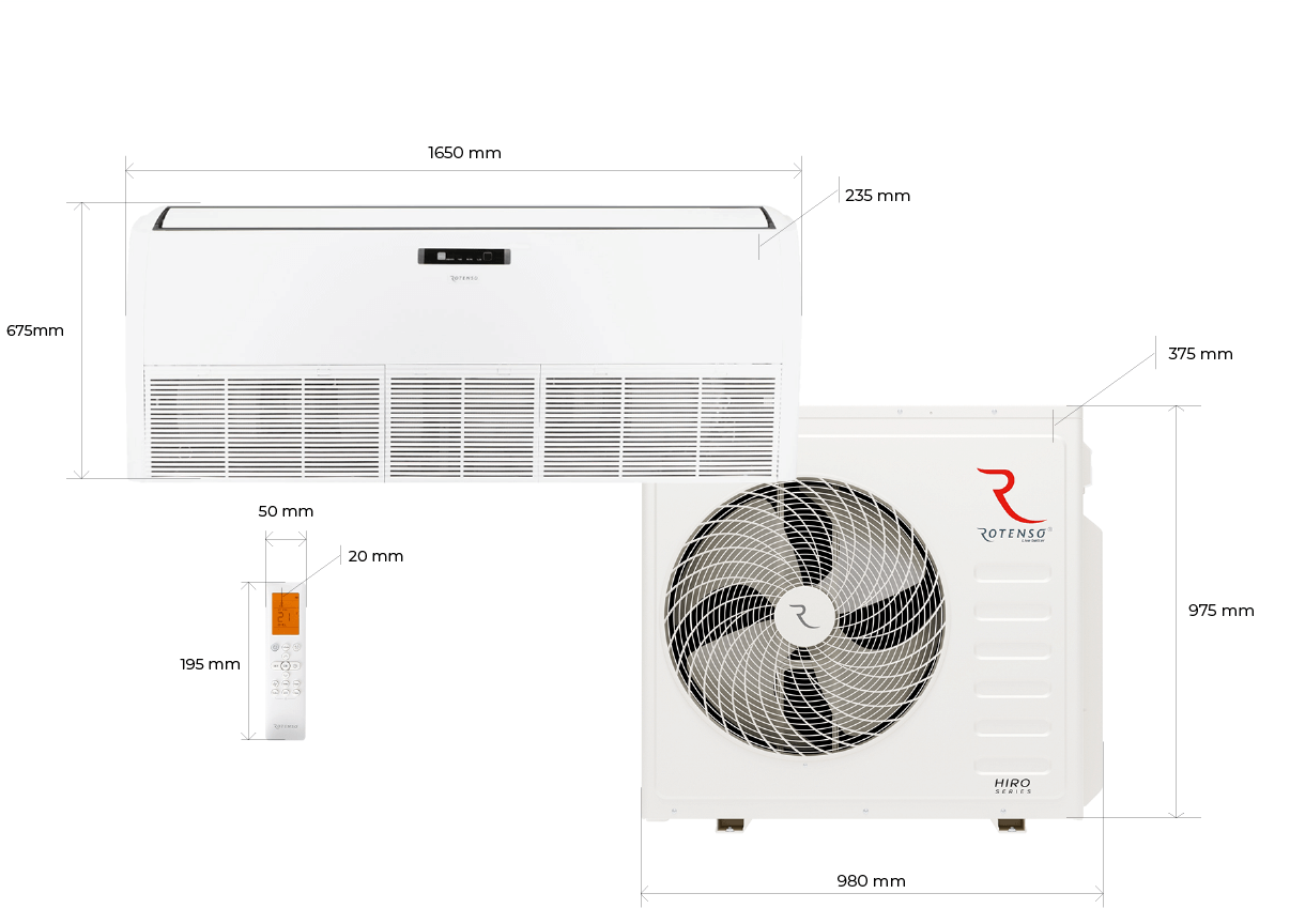 Podlahová a stropní klimatizace Rotenso ® Jato je univerzální zařízení, které lze namontovat jak na stěnu (vertikálně), tak na strop (horizontálně). Je k dispozici v sedmi výkonech (od 5,3 kW do 15,8 kW) a v chladicí třídě A++. Klimatizace Jato má účinný dálkový přívod vzduchu, který umožňuje chlazení velkých místností (např. konferenčních a banketních místností, čekáren, místností pro obsluhu zákazníků). Pozlacené lopatky zlepšují účinnost zařízení a účinně chrání klimatizaci před korozí.