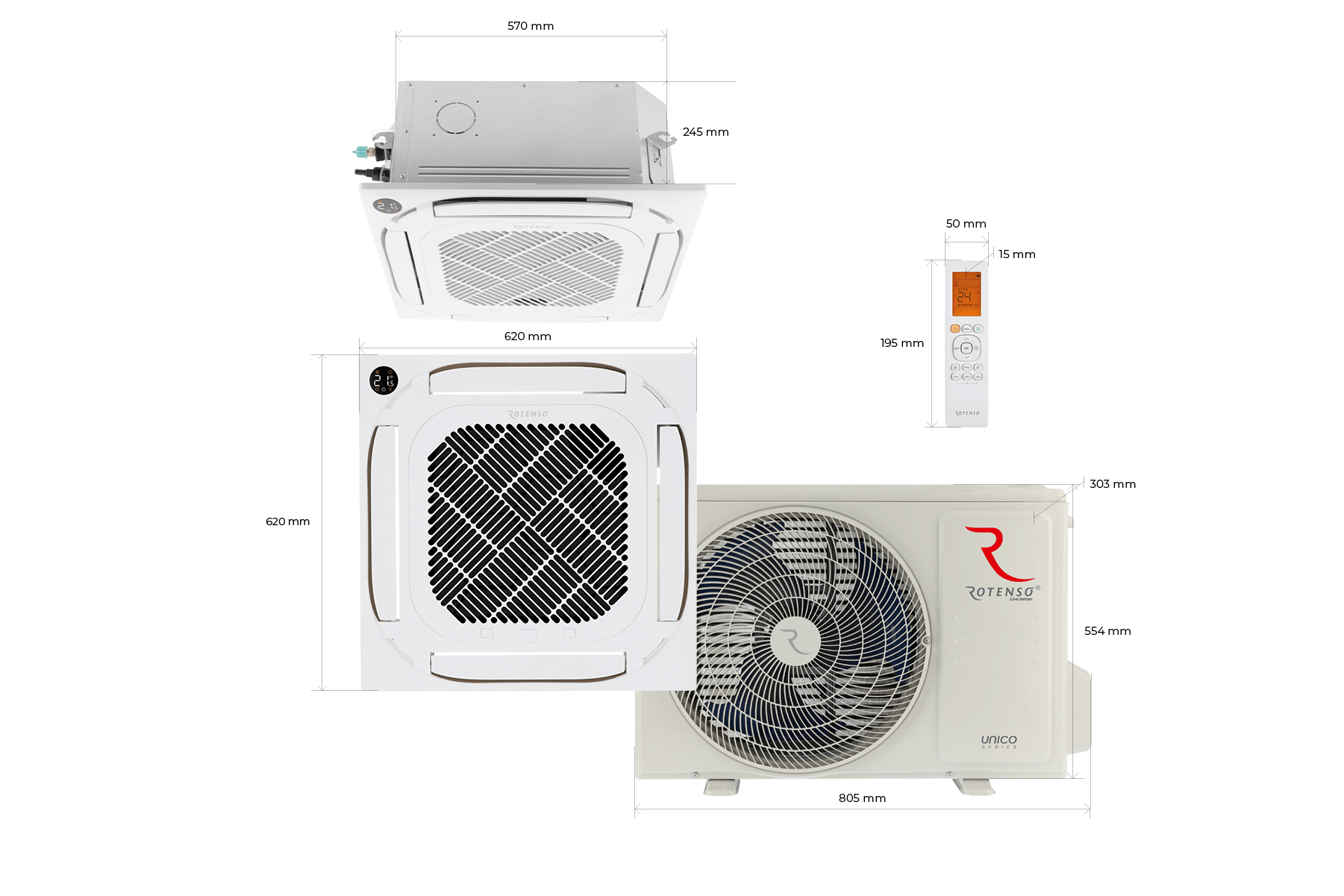 Kazetová klimatizace Rotenso® Tenji CC je k dispozici v rozměrech 620 × 620 a výkonech (od 3,5 kW do 5,3 kW), v chladicí třídě A++. Díky 360° konstrukci proudění vzduchu účinně rozvádí vzduch v místnosti a zajišťuje tak účinné chlazení nebo vytápění. Kazetová klimatizace Tenji má široké uplatnění v komerčních místnostech, kancelářích, obchodech, lékařských ordinacích, čerpacích stanicích apod. Kazetové jednotky se také stále častěji instalují do bytů a domů – všude tam, kde je podhled. Kazetové klimatizace Tenji se vyznačují širokými možnostmi regulace. Jako příslušenství jsou k dispozici následující ovladače: kabelové, centrální a střídavé.
